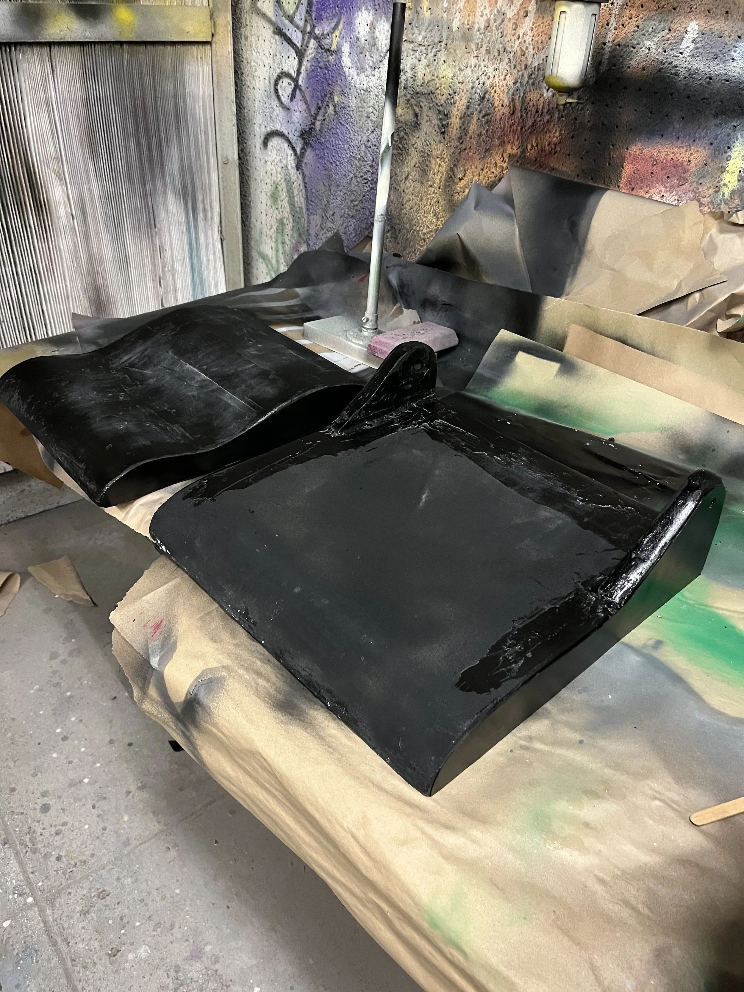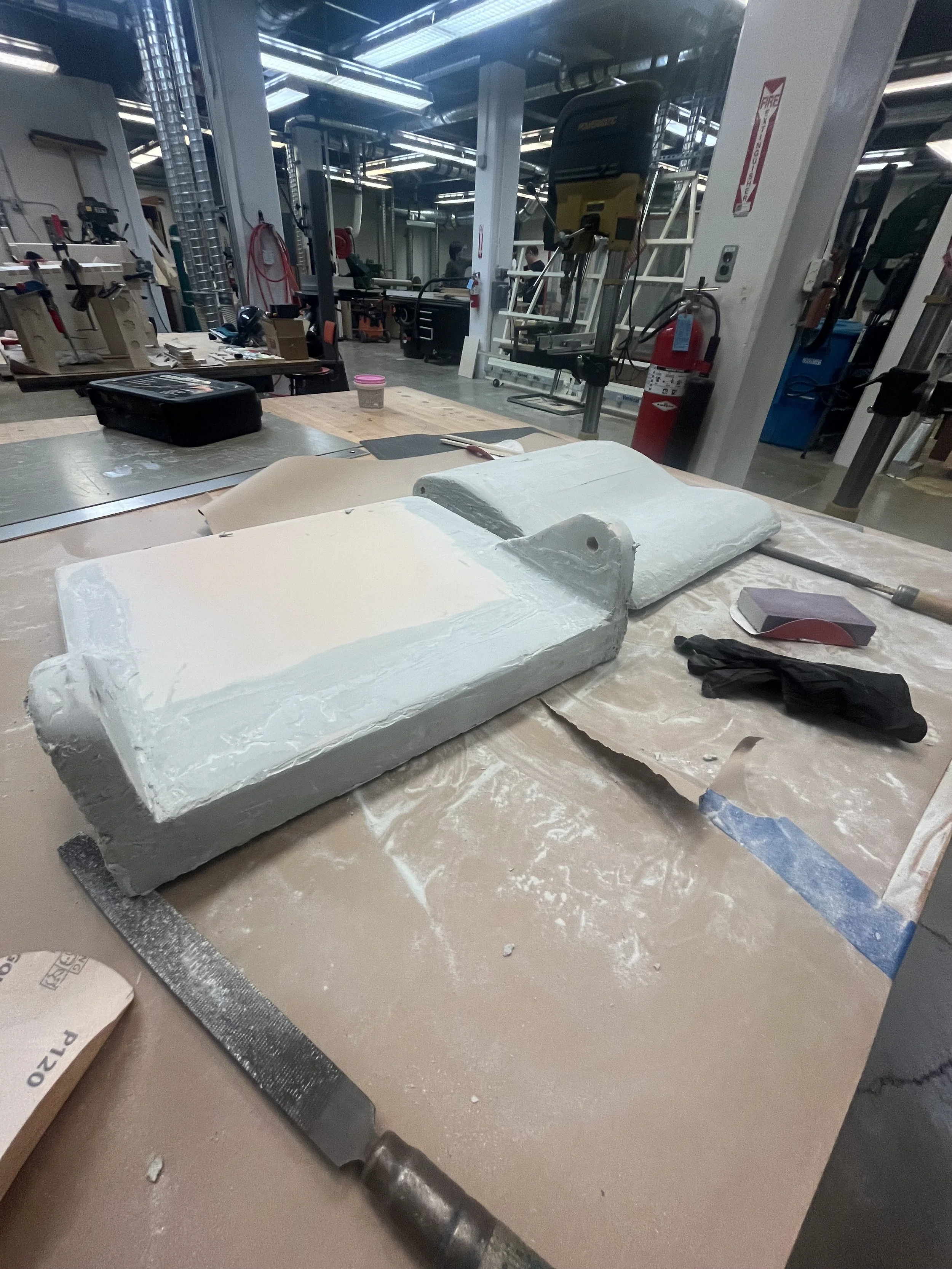 The final prototype for this project is an appearance model crafted with 4 lbs/ft³ density PU foam as the base structure, a perforated grid silicone padding, and faux leather upholstery. Base and seat were sculpted and finished with Bondo Automotive Body Filler and assembled with 1 1/4 inch screws for a hinged design to allow the user to fold the seat down and stow it when it is not being used.