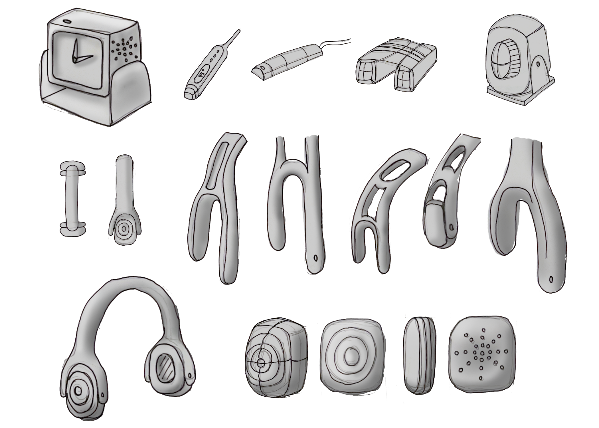 A thin strip of Polypropylene thermoformed around a bowl to create a headband, and cut to size to achieve the desired curve. Hinges were added to the ear covers and fastened with pins, and thin layers of soft foam were glued to the headband to add volume and provide cushioning for user comfort.